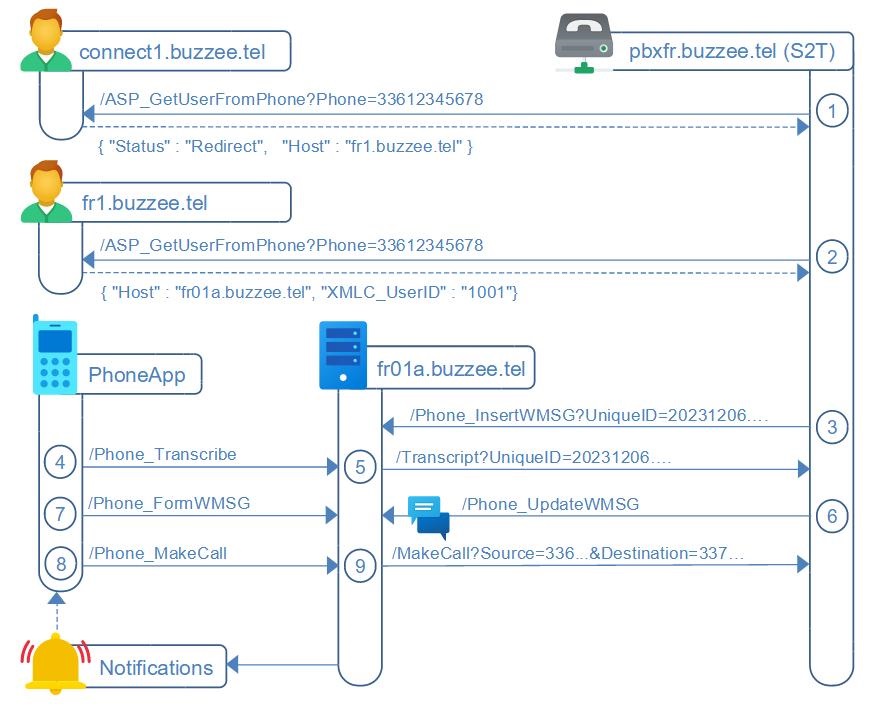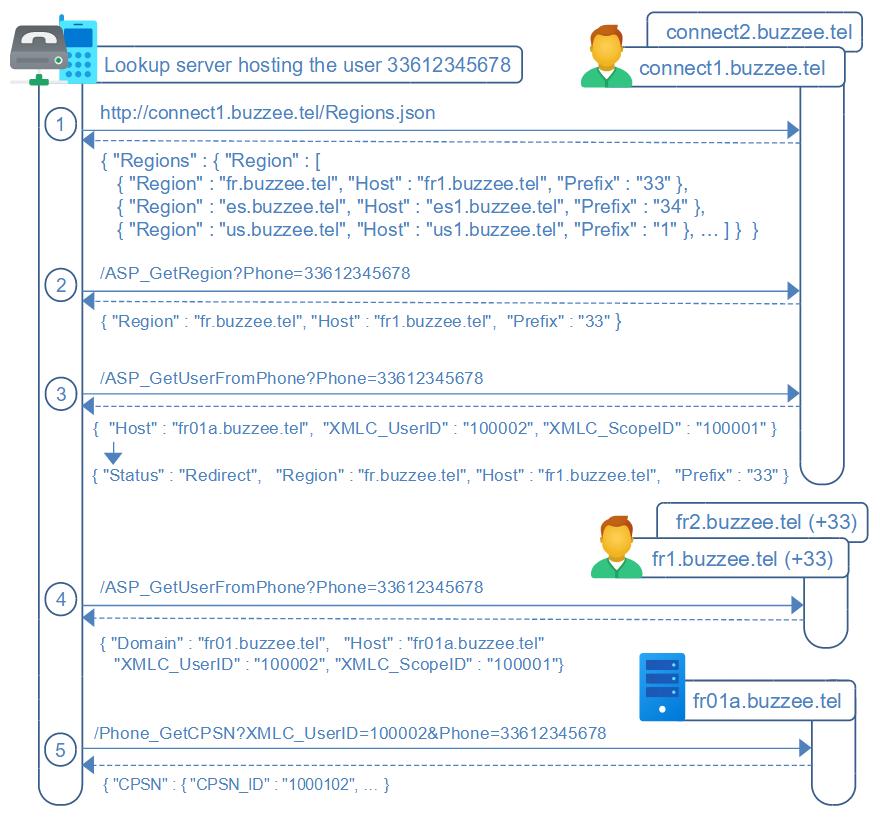 4. Lookup on the regional server https://fr1.buzzee.tel/JSON/ASP_GetUserFromPhone?Phone=33612345678 to obtain the local server hosting the user account.