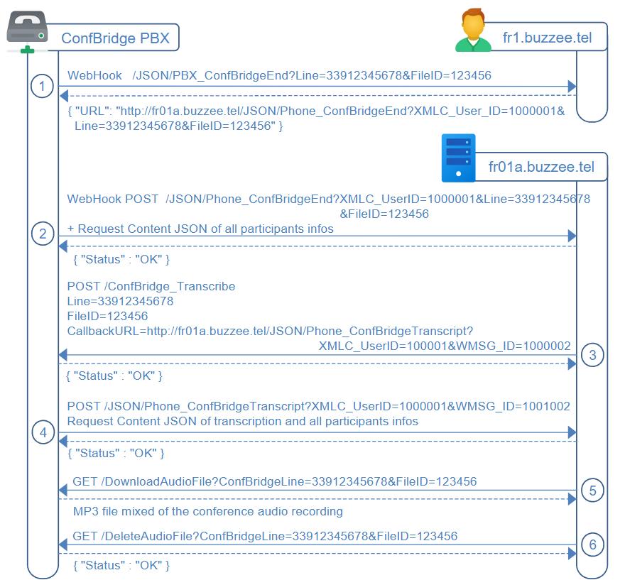 1. At the end of each conference ConfBridge PBX invokes the regional server to the registered WebHook URL http://fr1.buzzee.tel/JSON/PBX_ConfBridgeEnd?Line=33912345678&FileID=123456 passing through the main parameters of Conference Line ID and the Unique File ID for this conference audio recording.