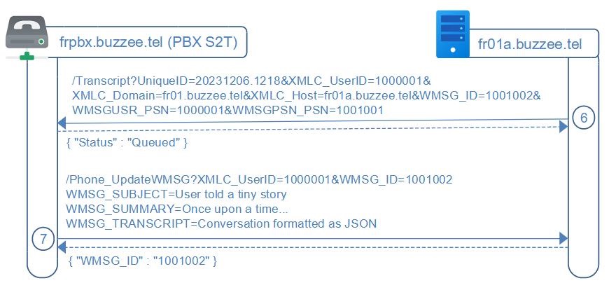7. Once the transcription has been completed, the PBX sends a Phone_UpdateWMSG request with WMSG_SUBJECT, WMSG_SUMMARY and WMSG_TRANSCRIPT parameters