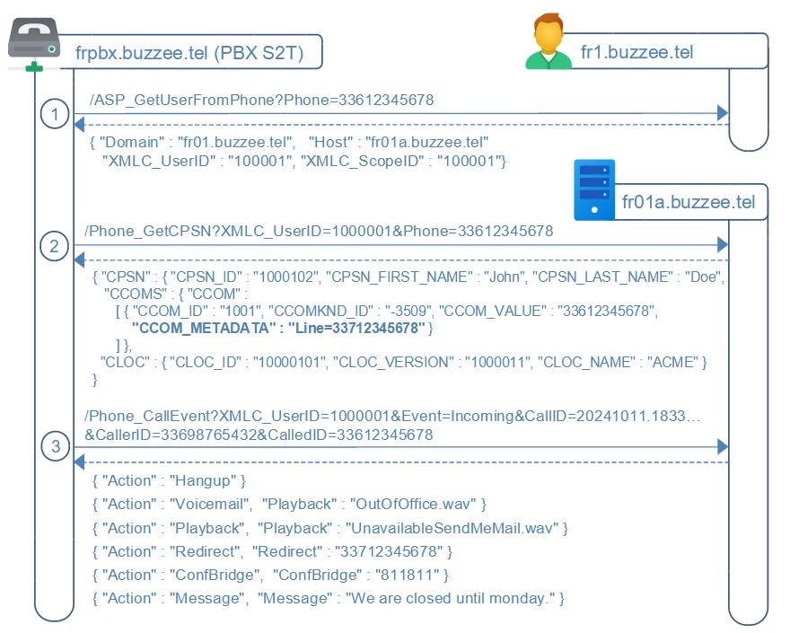 3. the PBX server will query fr01a.buzzee.tel /Phone_CallEvent with parameters Event=Incoming, CallerID and CalledID to retrieve the custom Action to perform.